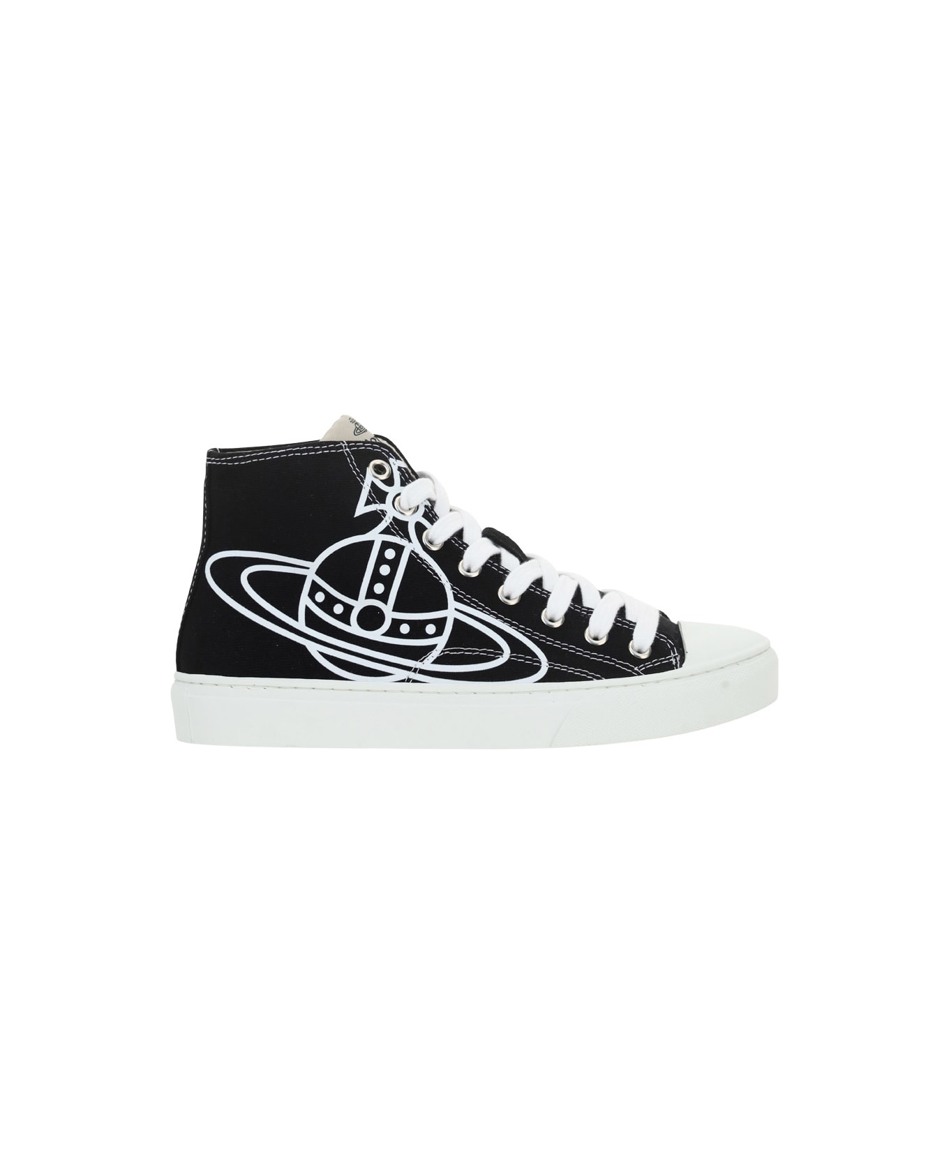Cotton plimsoll sneakers by vivienne westwood, reinforced round toe, ankle-length design, lace-up front fastening, contrasting iconic brand logo on outer side panel, contrasting embroidered brand signature label on front tongue.
