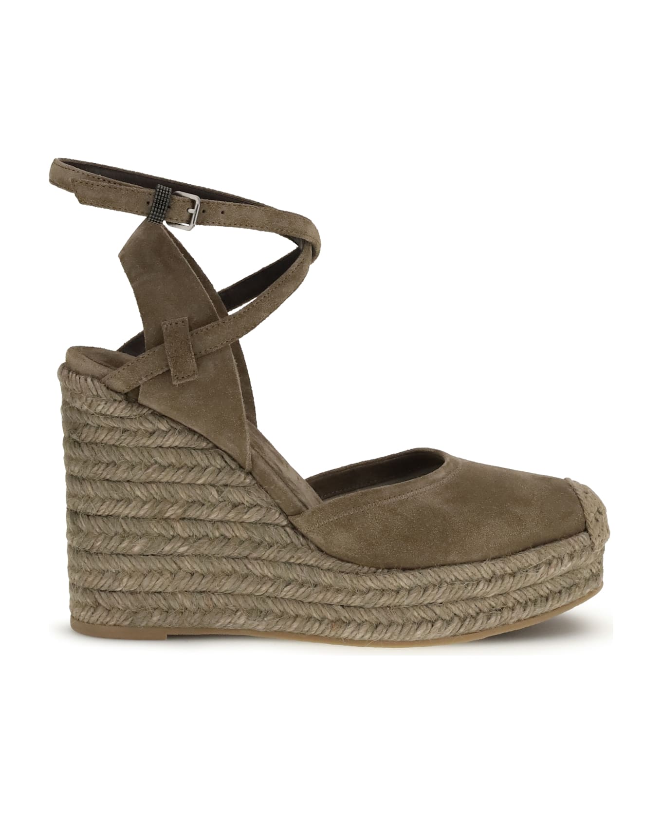 The precious loop espadrilles by brunello cucinelli combine craftsmanship and refined style. made of suede with suede lining, they feature a rope sole with a lightweight micro tread and an approximately 8-cm wedge at the highest point. the closure is adjustable via a strap, while the nickel-free jewel decoration adds an elegant and distinctive touch.