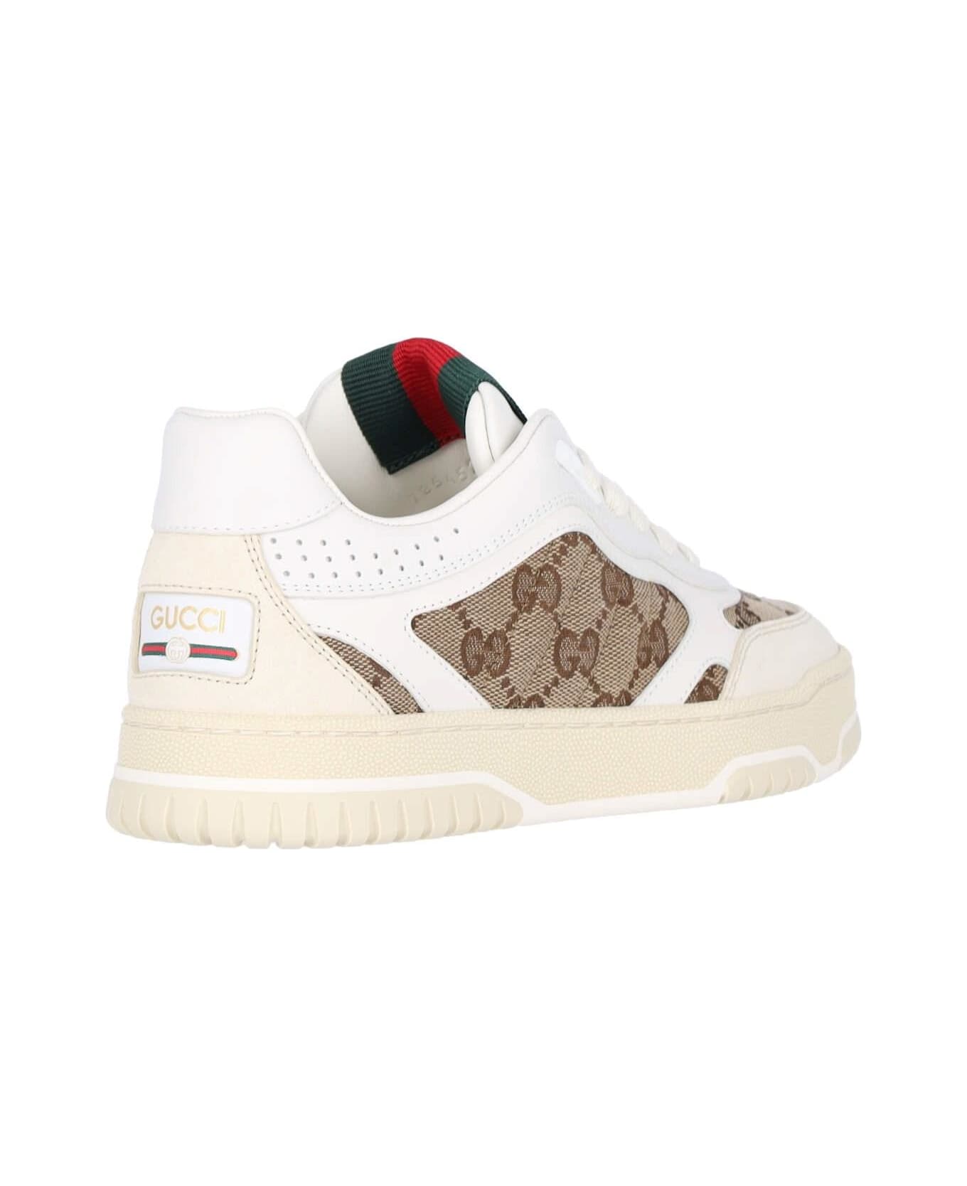 Gucci Re-Web white leather sneakers with beige Original GG fabric details, round toe, lace-up closure, green and red Web ribbon applied on the tongue, logo patch on the cream insert on the back, cream textured rubber sole. composition: 100% leather