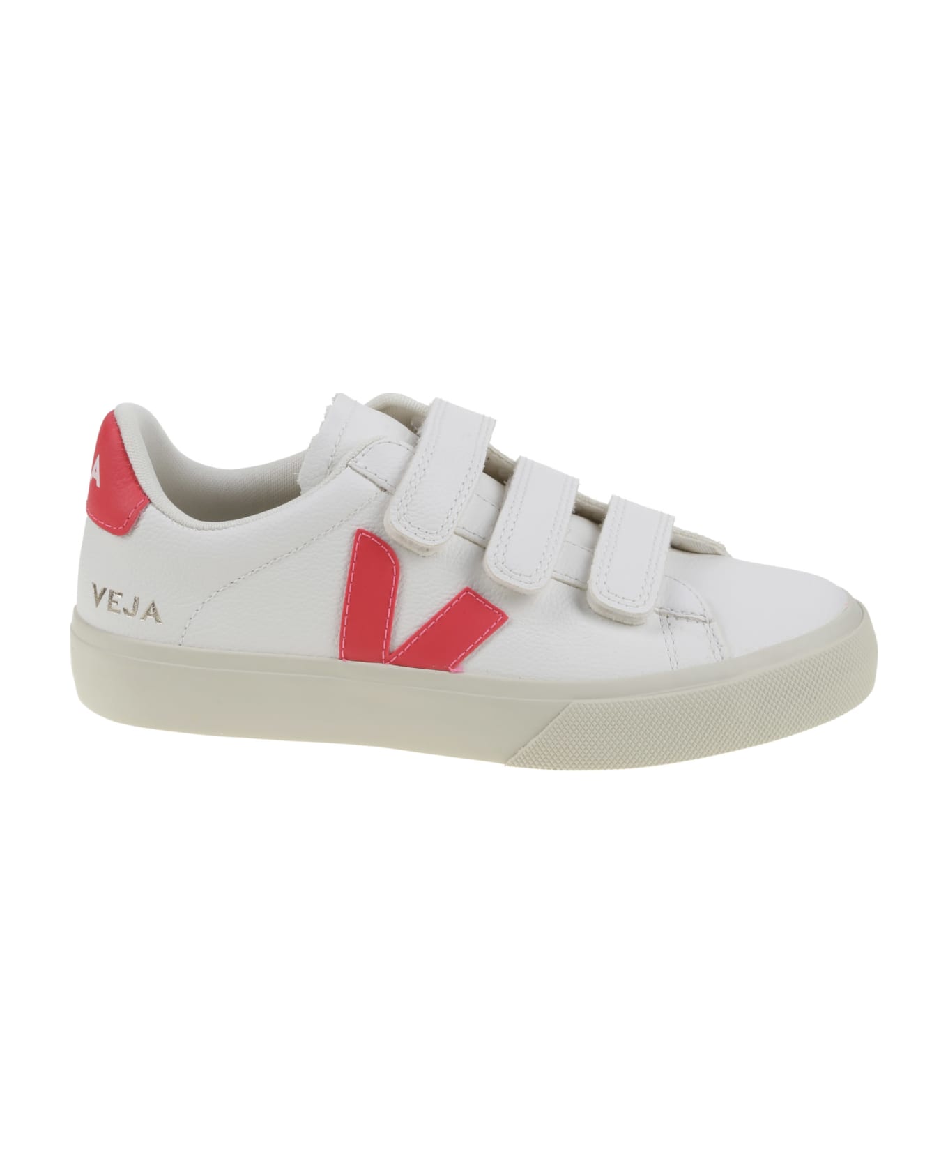Veja Sneaker in white leather, velcro closure, neon pink logo detail, rubber sole. Composition: 100% Lh
