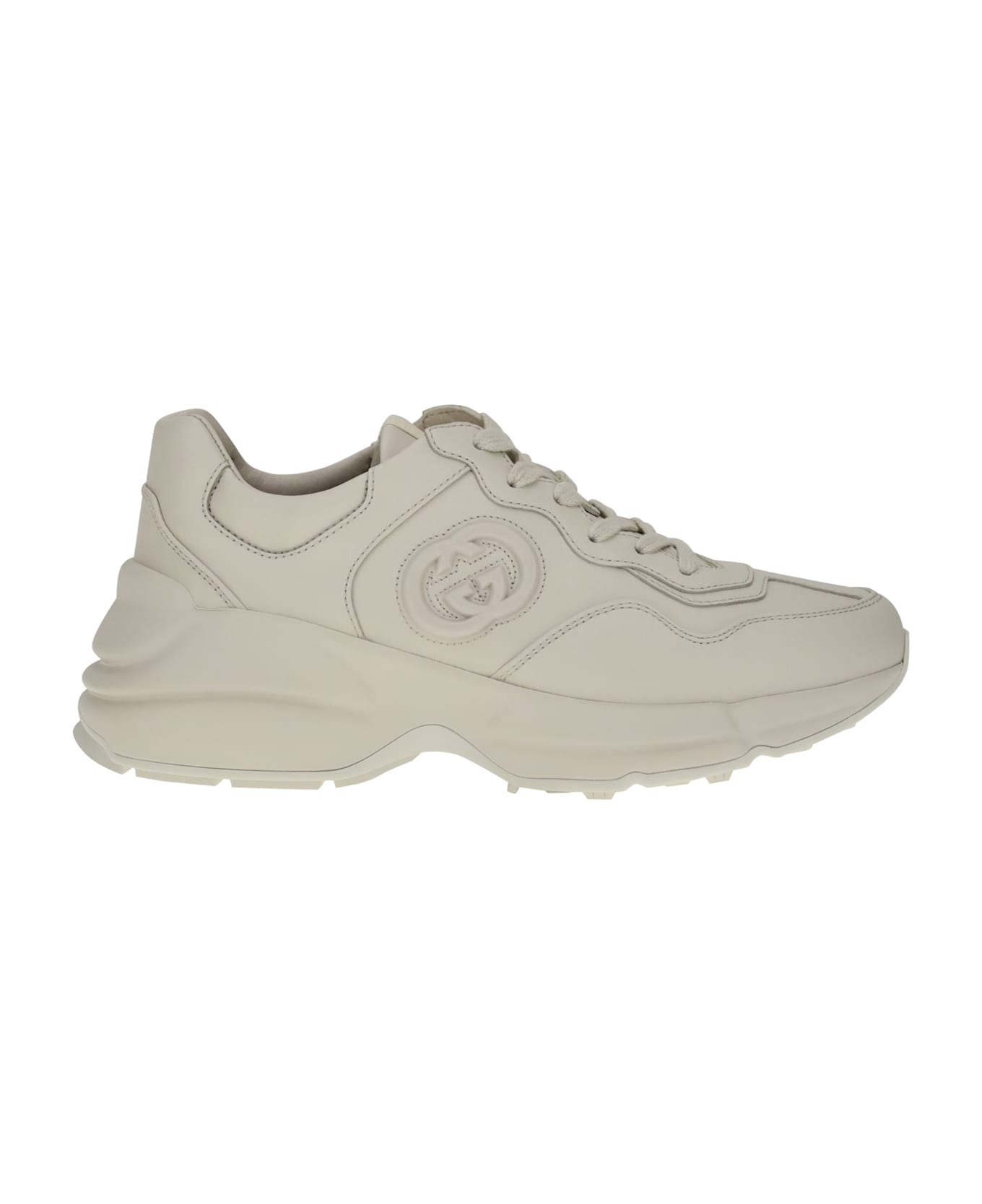 Gucci's rhyton sneakers embody a bold, urban aesthetic inspired by streetwear style. featuring a lace-up closure, they are distinguished by the side rounded logo that adds a graphic and distinctive touch. the rugged rubber sole ensures comfort and stability, making them ideal for stylish everyday wear.