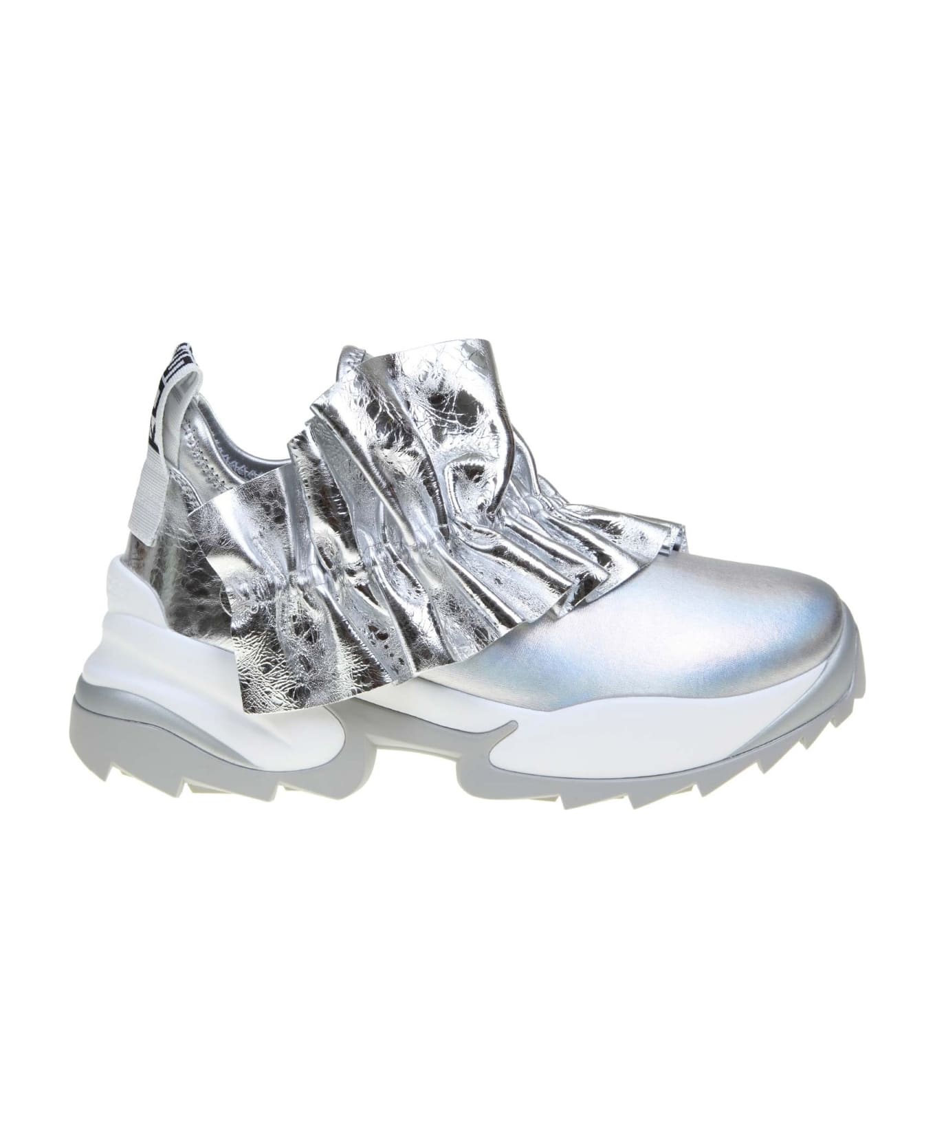 Sneakers in patent leather silver colour model with round tip removable ruffle detail on the top logo tie on the back leather interior external composition: 49% fabric (80% pa, 20% ea), 46% laminated calf, 5% fabric (60% pu, 40% pl) internal composition: 100% calfskin lining sole: 100% rubber made in italy