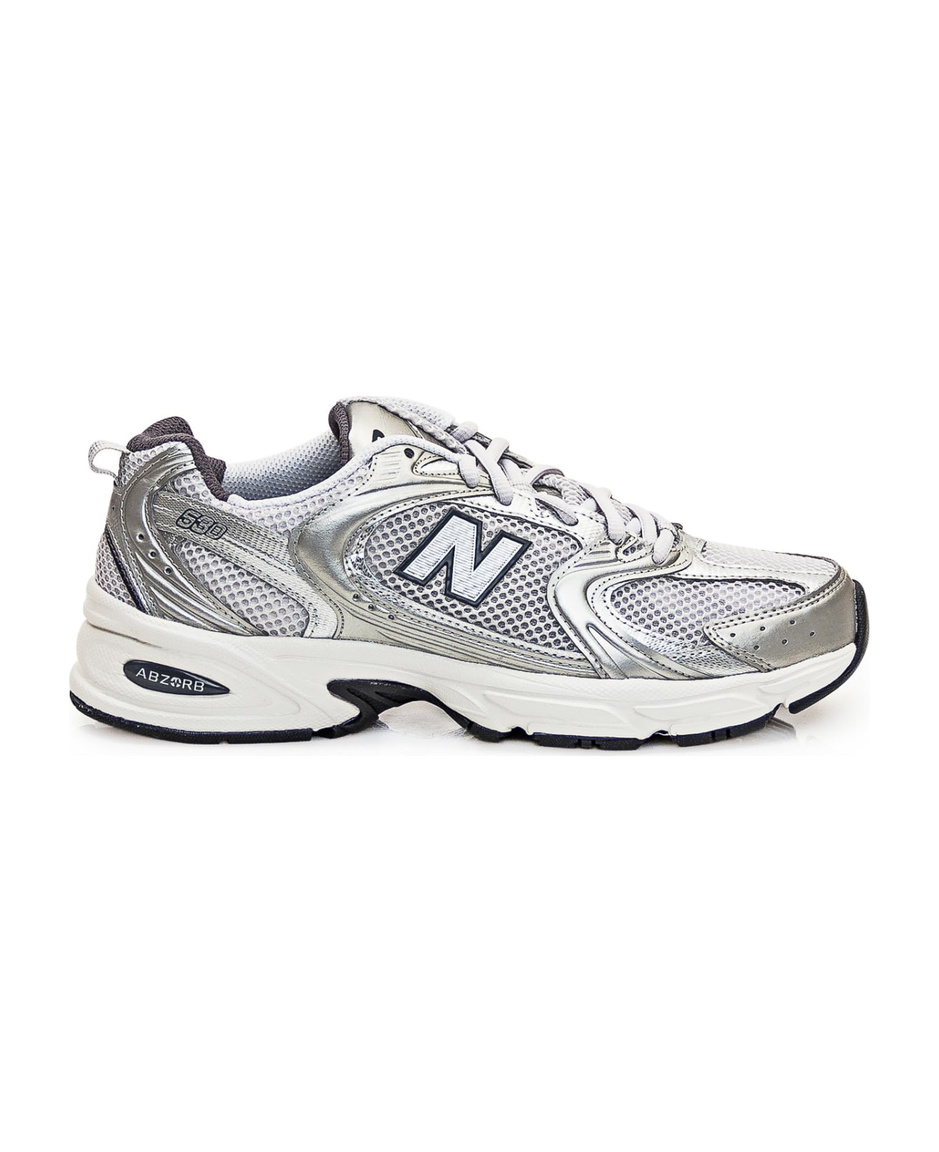 Silver sneaker. Mesh details. Closure with laces. Logo on tongue, heel and sides.