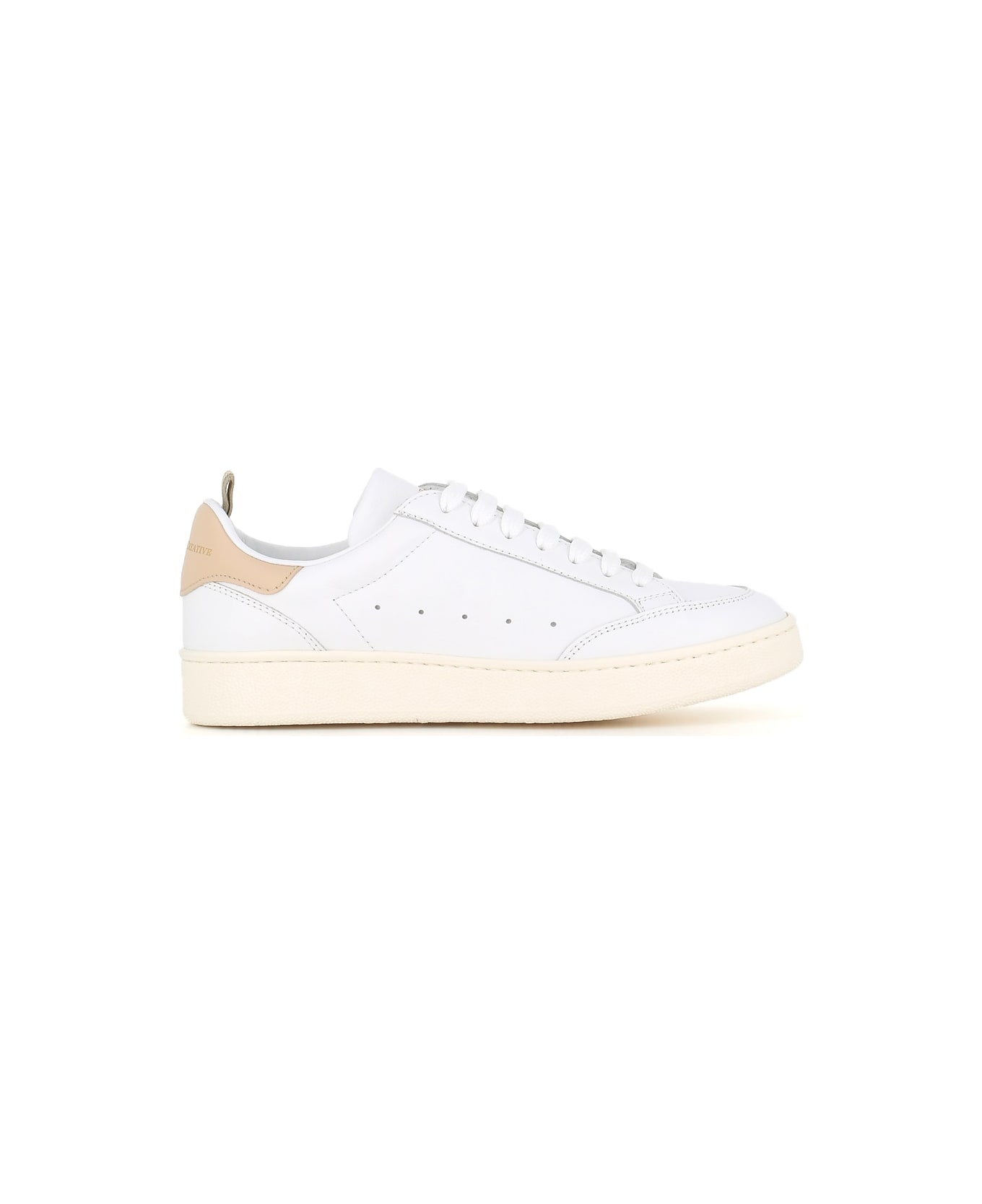 White soft leather Sneaker from Officine Creative, featuring by a round toe and beige leather heel. Flexible rubber fund. Intersole with removable rise. Lined interior. Heel: 3 cm