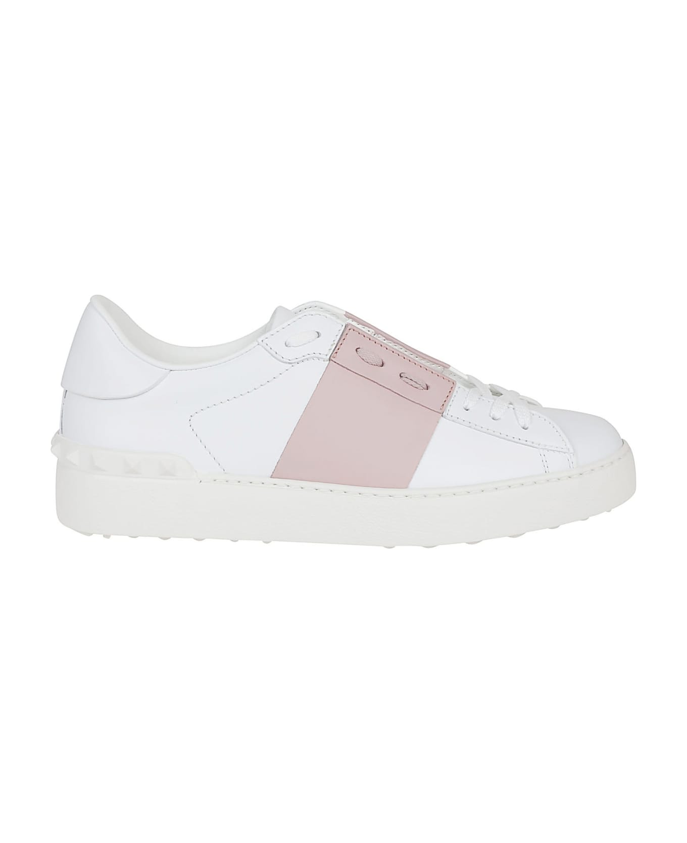 Classic VALENTINO GARAVANI Open sneakers in white calfskin. Featuring a contrasting nude leather band. White rubber sole with tone-on-tone studs on the back. Ideal to be worn both for a casual outfit and for a more elegant outfit. A must of the brand, present in all collections with the color variant!