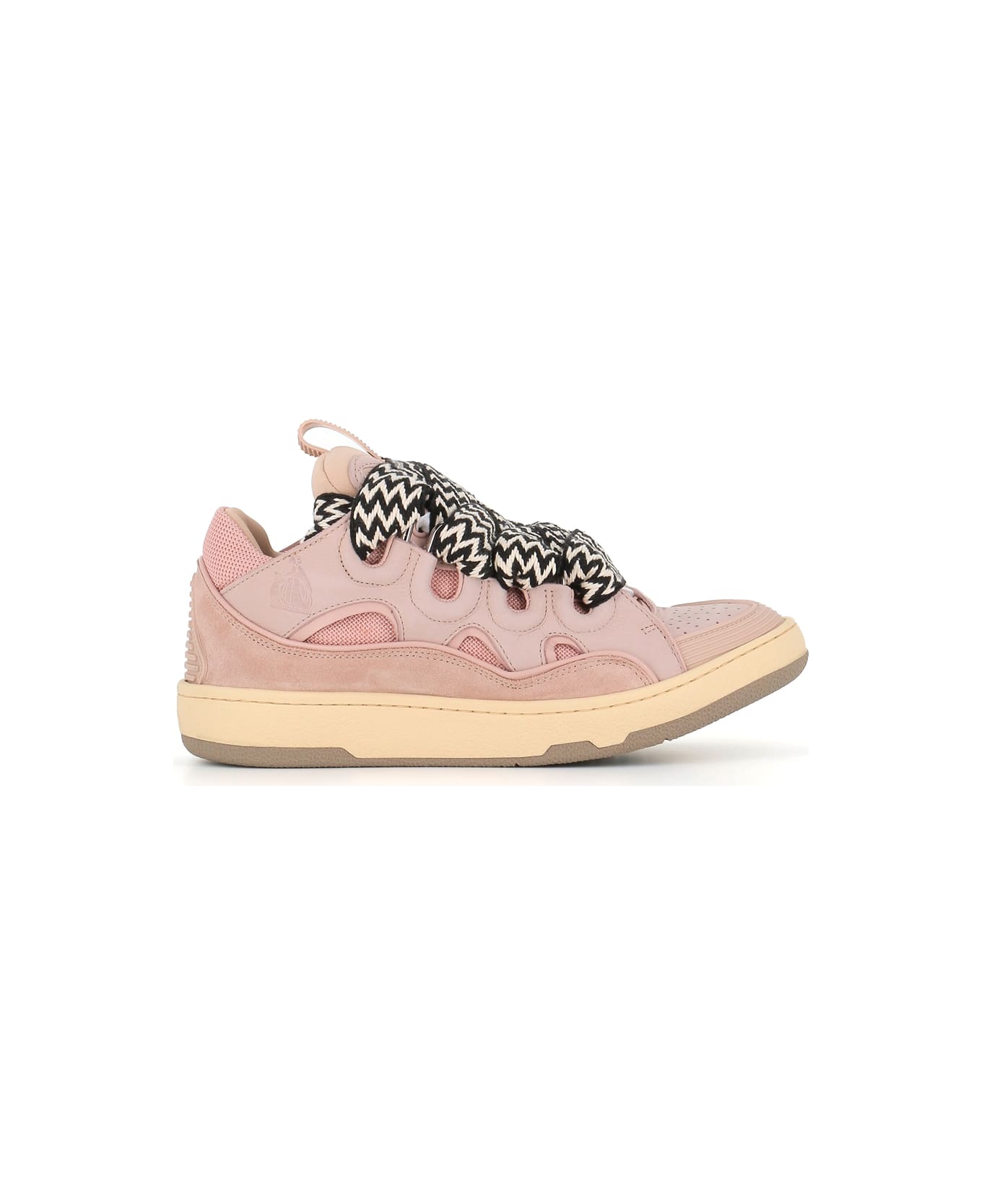 Pale pink leather and mesh Sneaker from Lanvin, featuring by a round toe, padded matelassé tongue with logo and curved metal eyelets. Multicolor double waxed lurex herringbone laces. Lined interior. Heel: 3,5 cm Composition: Leather