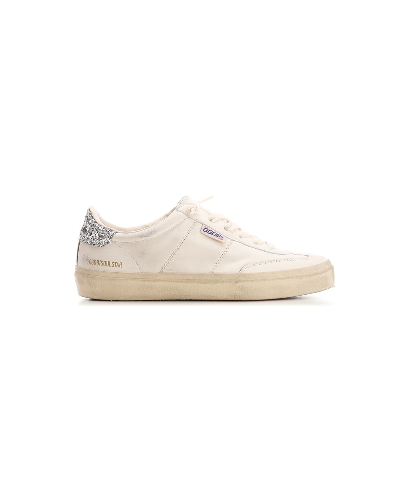 'Soul Star' sneakers from Golden Goose, with flat laces, silver glitter heel tab, gold stamp with side logo, 3 cm flat sole.