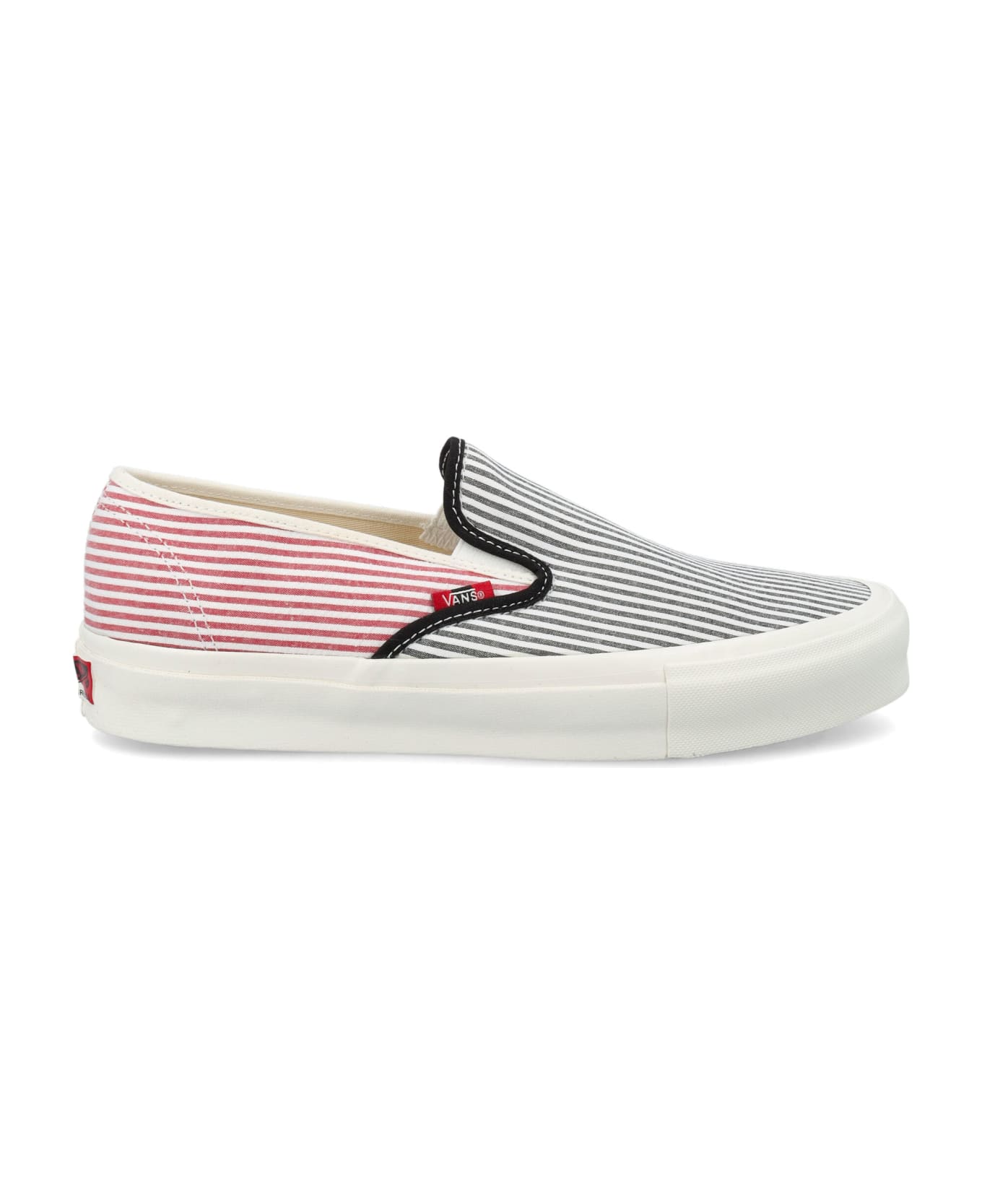 White, Blue And Red Canvas Striped Og Style 48 Sneakers By Vans. Featuring: Round Toe Elastic Side Panels Slip-on Striped Pattern Logo Label At Side Blue Flat Rubber Sole