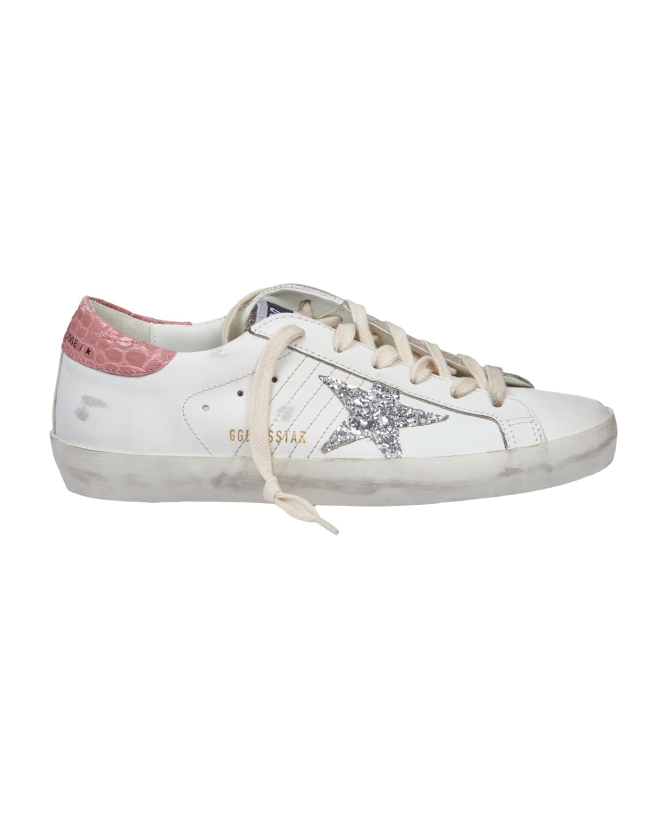 Super Star model sneakers in white with star in relief on the sides. Contrasting pink heel. Vintage effect. Composition: 100% leather. Sole: 100% rubber. Total height 5 cm. Made in Italy.