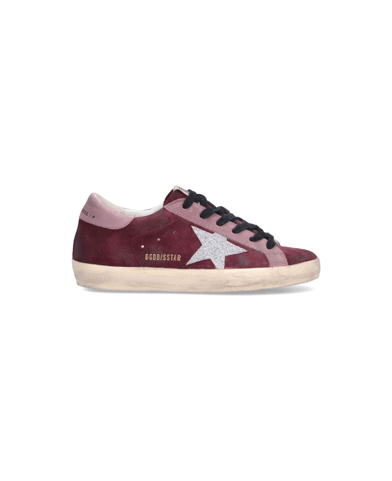 Golden Goose "Super-Star" sneakers in burgundy red suede with distressed details, round toe, black laces, cream logo label on the tongue, silver glitter star patch on the side, gold logo print on the side, contrasting logo print on the tab, cream rubber sole.