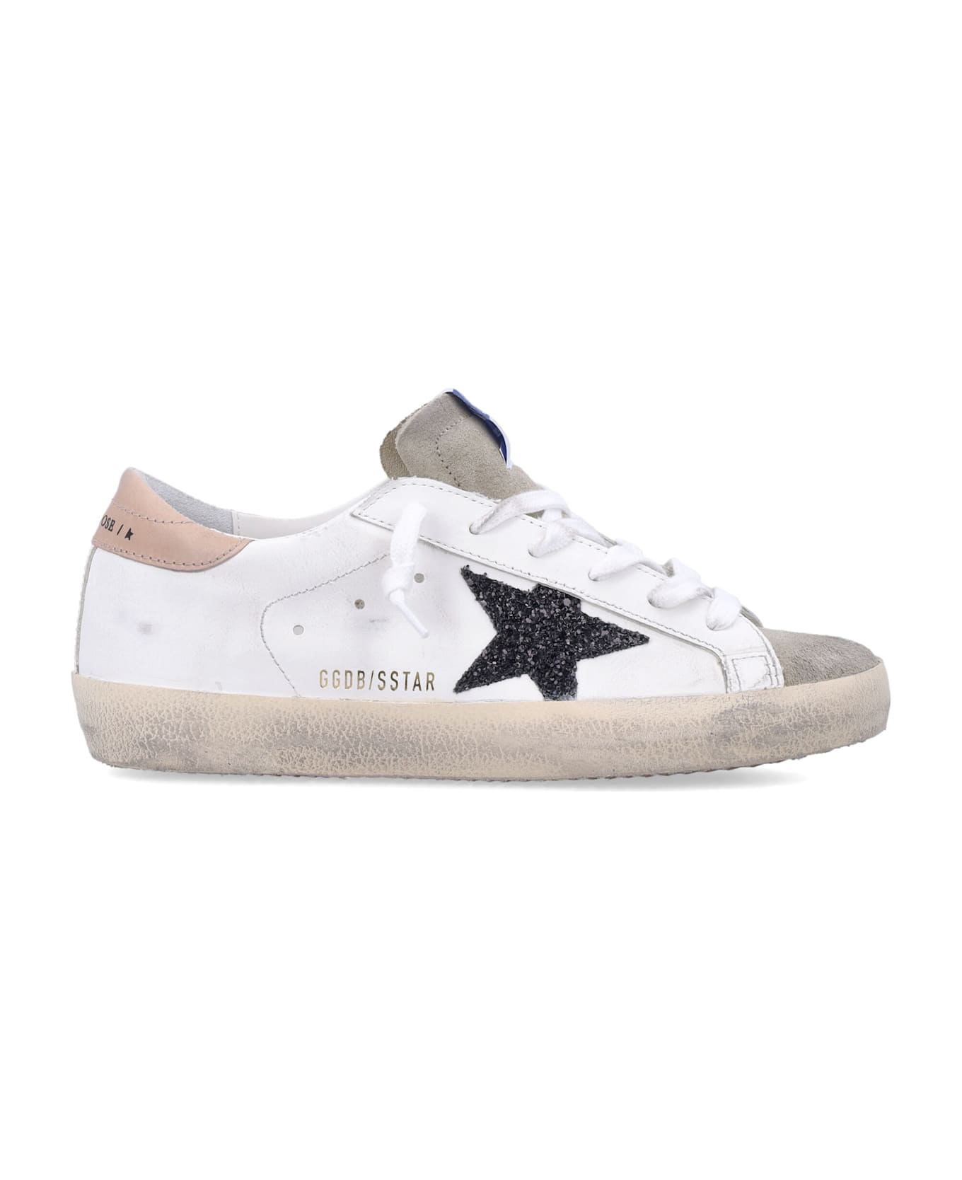 Super-star Woman's Sneakers By Golden Goose. Featuring: Leather Upper Suede Leather Toe Lace-up Fastening Logo Label At Tongue Black Glitter Star Patch Rubber Sole Vintage Effect