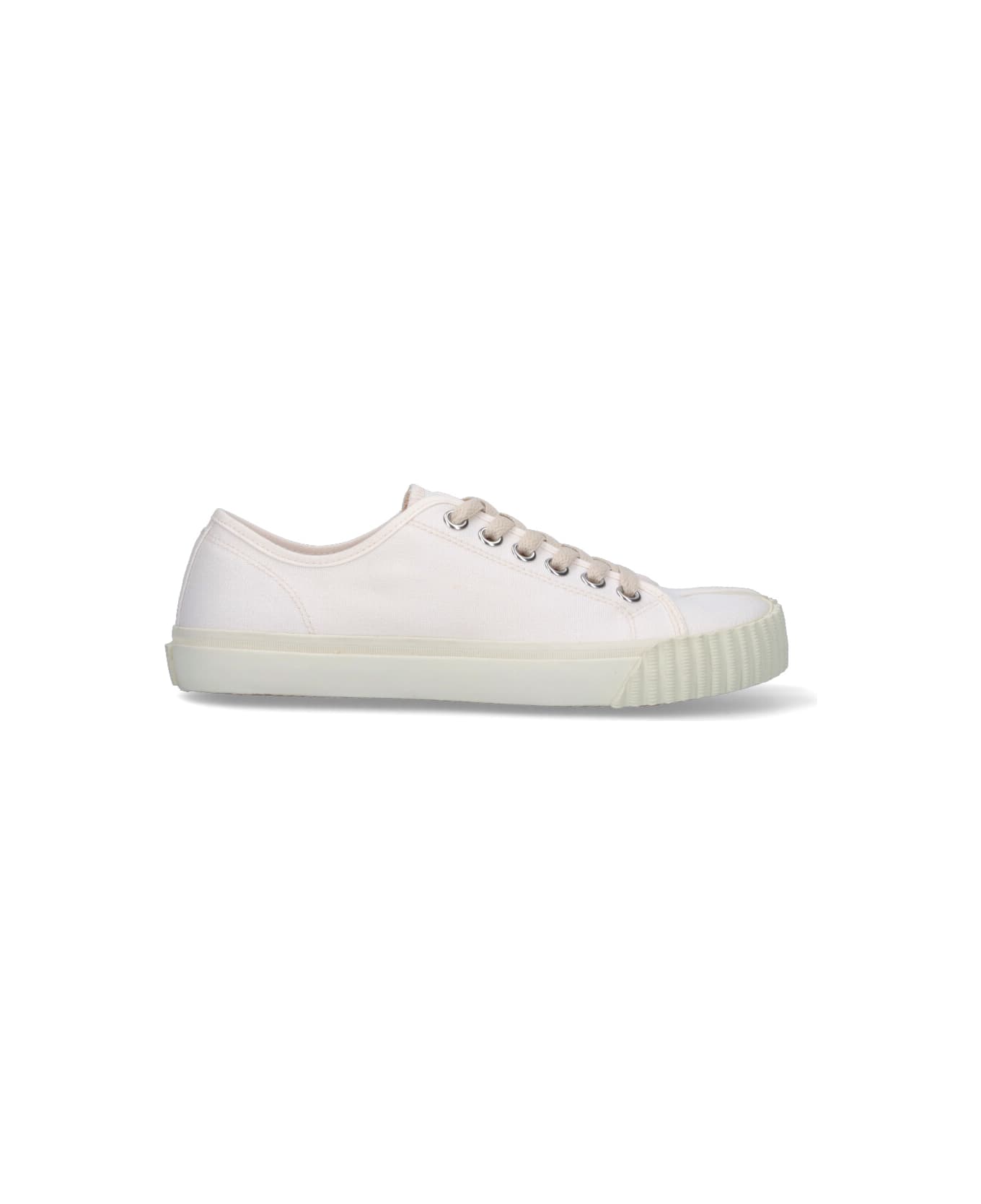 Maison Margiela "Tabi" fabric, cream color sneakers with round tabi detail toe, lace-up closure, rubber sole, and a tone-on-tone embossed logo detail at the back. Composition: 100% Cotone