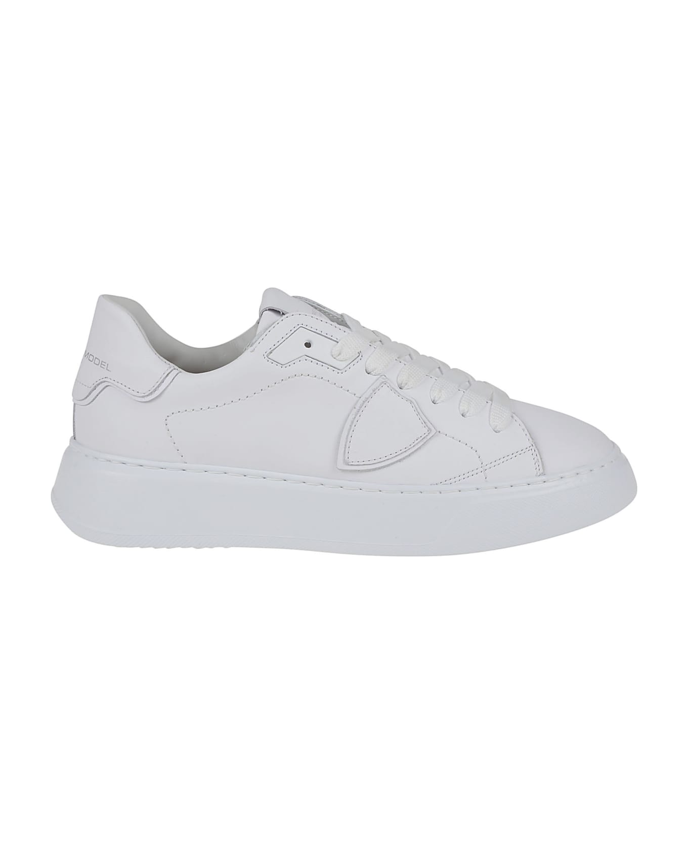 Sneaker with logo applied laterally in white leather by Philippe Model Paris. Featuring a branded heel counter, a side logo tab, a round toe, a lace-up front fastening, a branded insole and a flat rubber sole.
