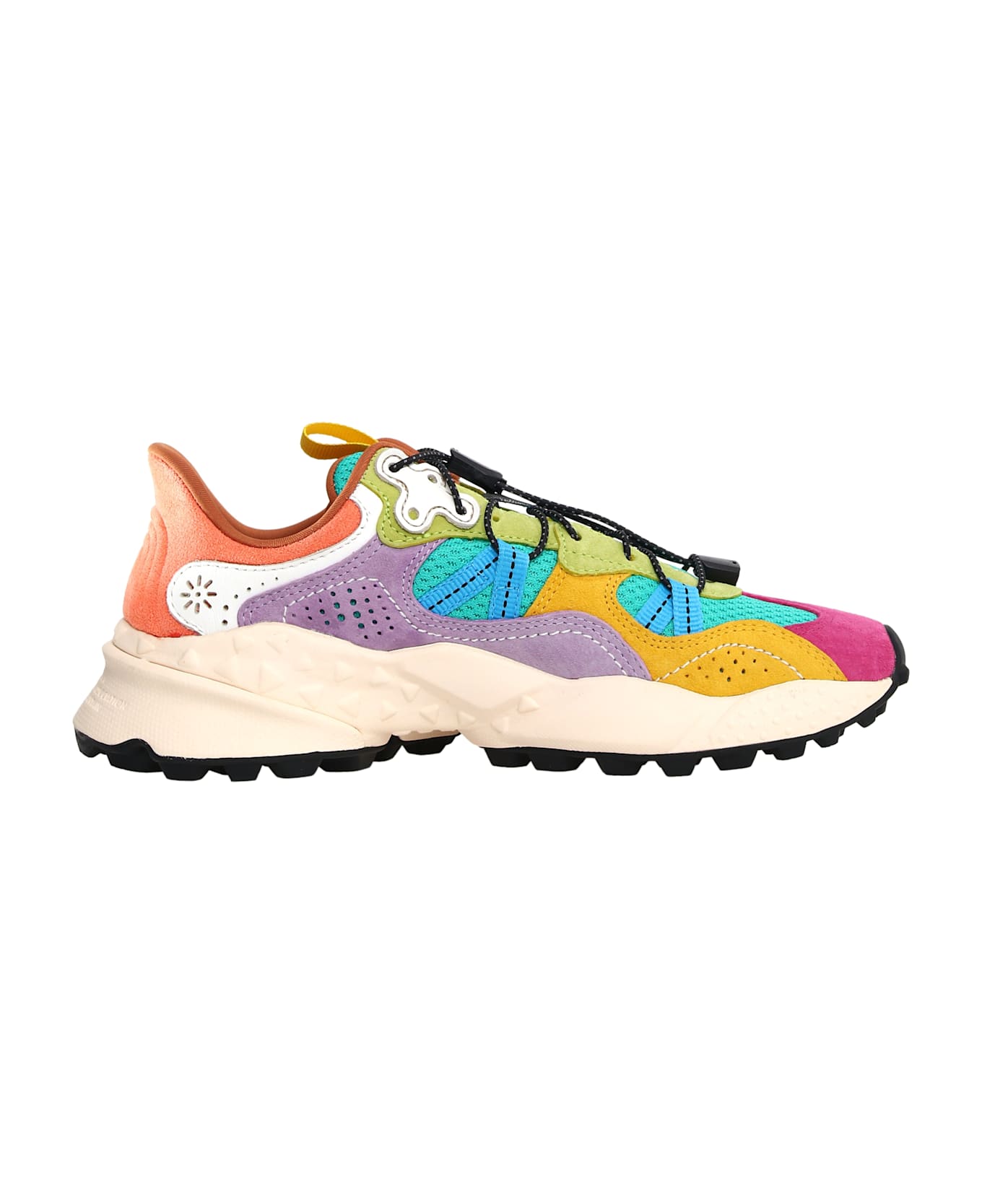 "Flower Mountain sneakers made of technical fabric with multicolored suede inserts. Reinforced eyelets and trekking laces. Inner insole made of antibacterial natural cork, ultra-light rubber sole with a serrated tread. "