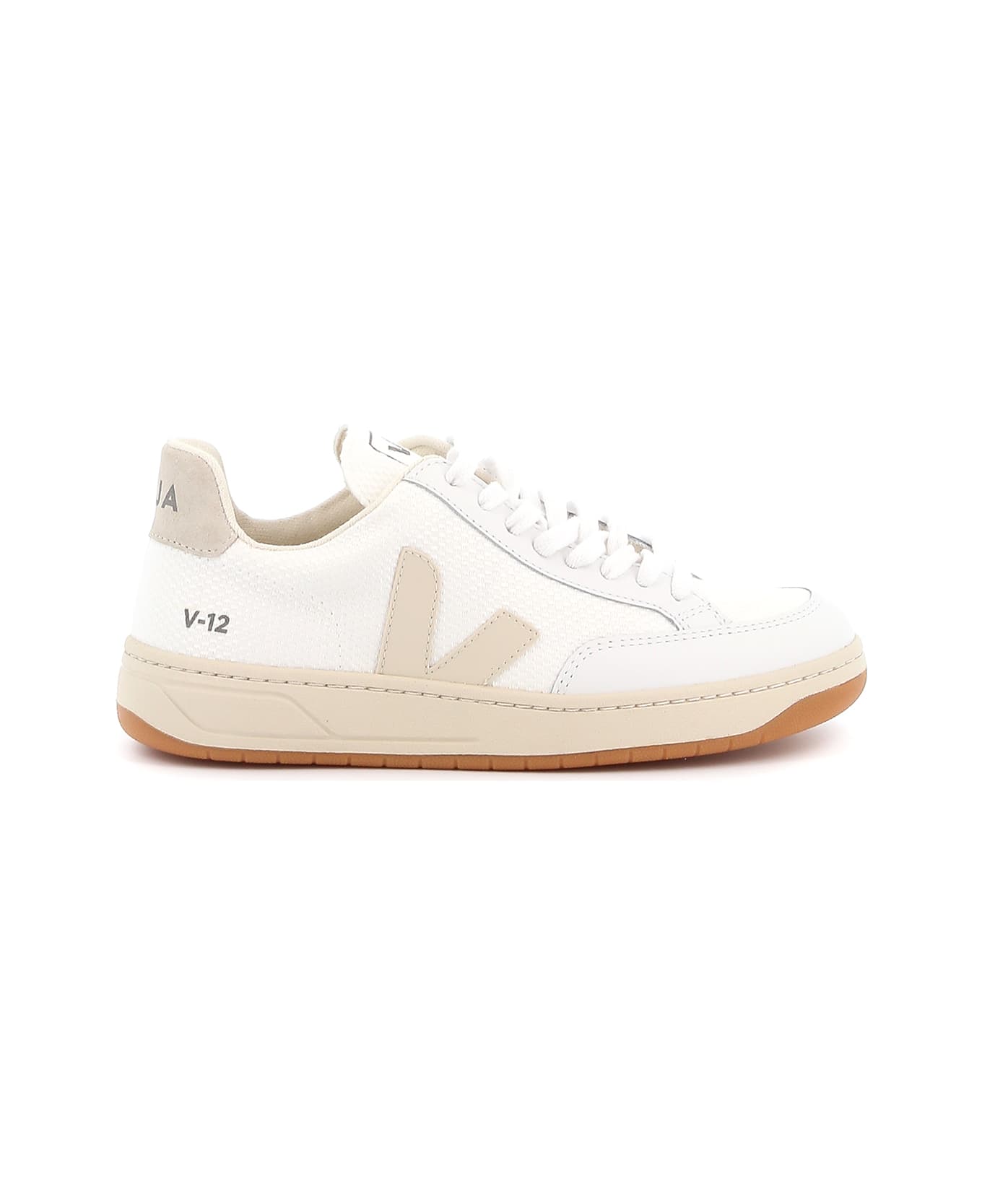 Veja sneaker in technical fabric and white leather, side logo detail in beige leather, beige insert on the back, rubber sole.