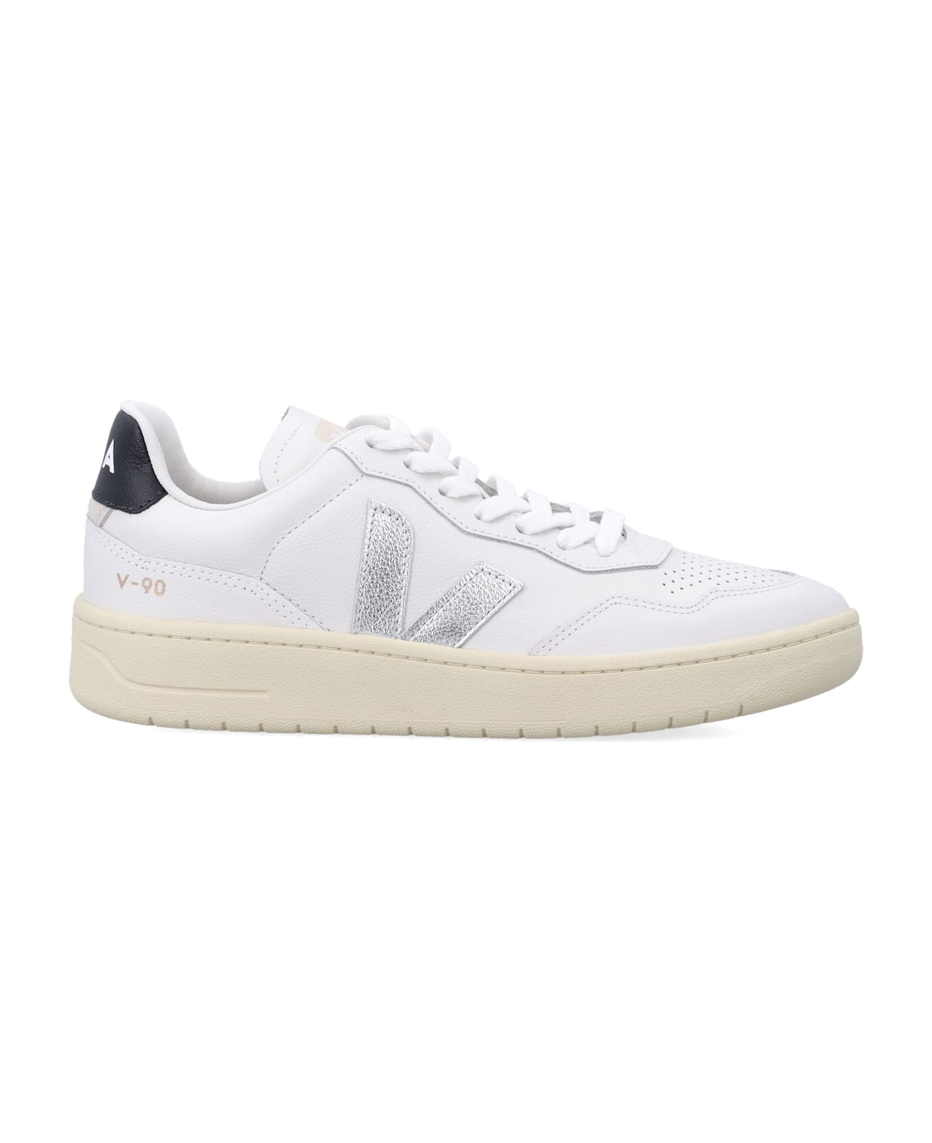 The Veja V-90 Sneakers Combine Retro Inspiration With Modern Sustainable Design. Crafted In Soft White Leather, They Feature A Metallic Silver v Logo On The Side And A Contrasting Black Heel Tab. The Natural Rubber Sole And Eco-conscious Materials Highlight The Brand s Commitment To Sustainability While Ensuring Everyday Comfort And Versatile Style. Premium White Leather Upper