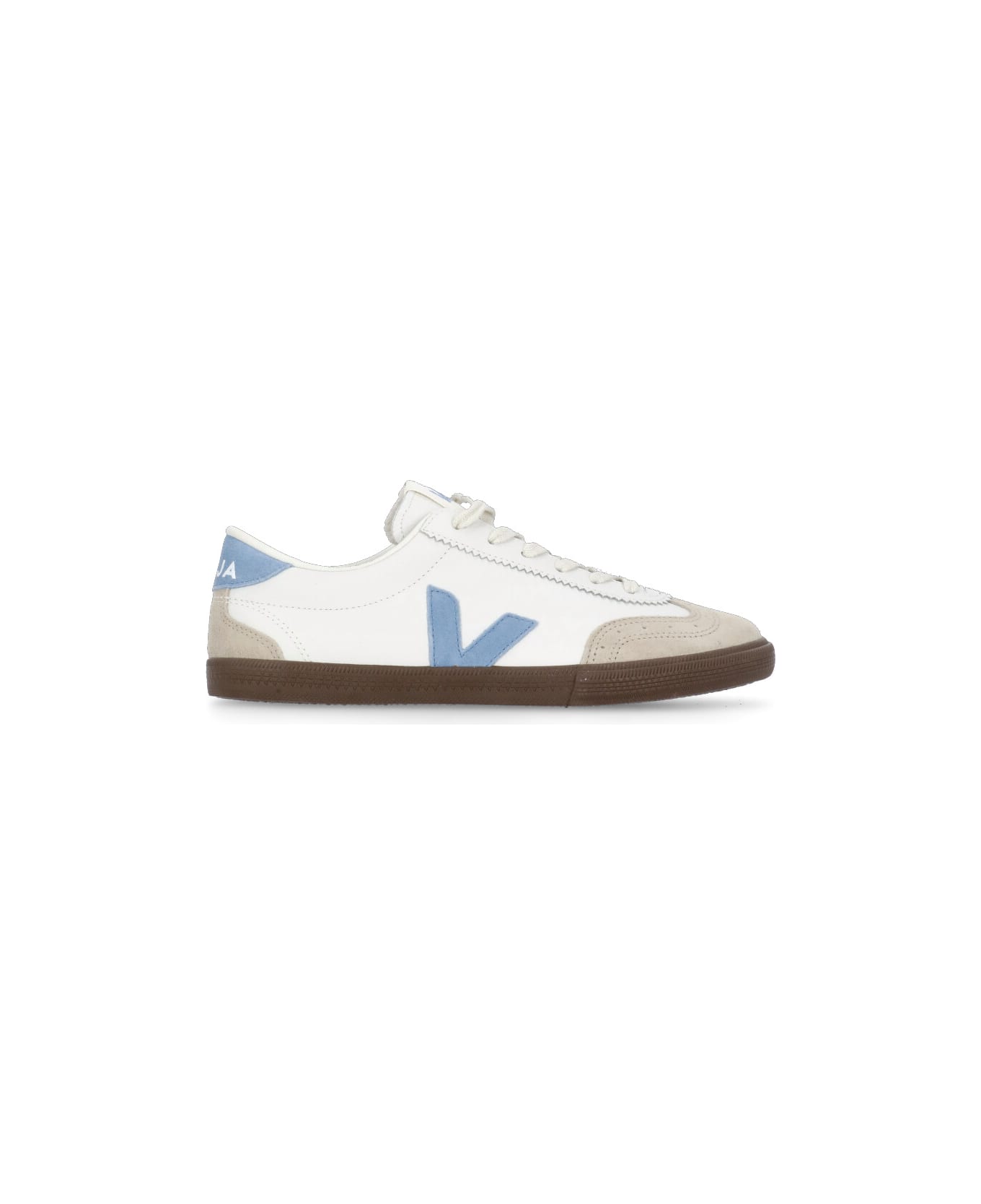 - White Veja leather sneakers for woman - Contrasting color round toe - Front laces fastening - Contrasting colour upper heel with logo - Suede leather inserts - Side contrasting colour V logo