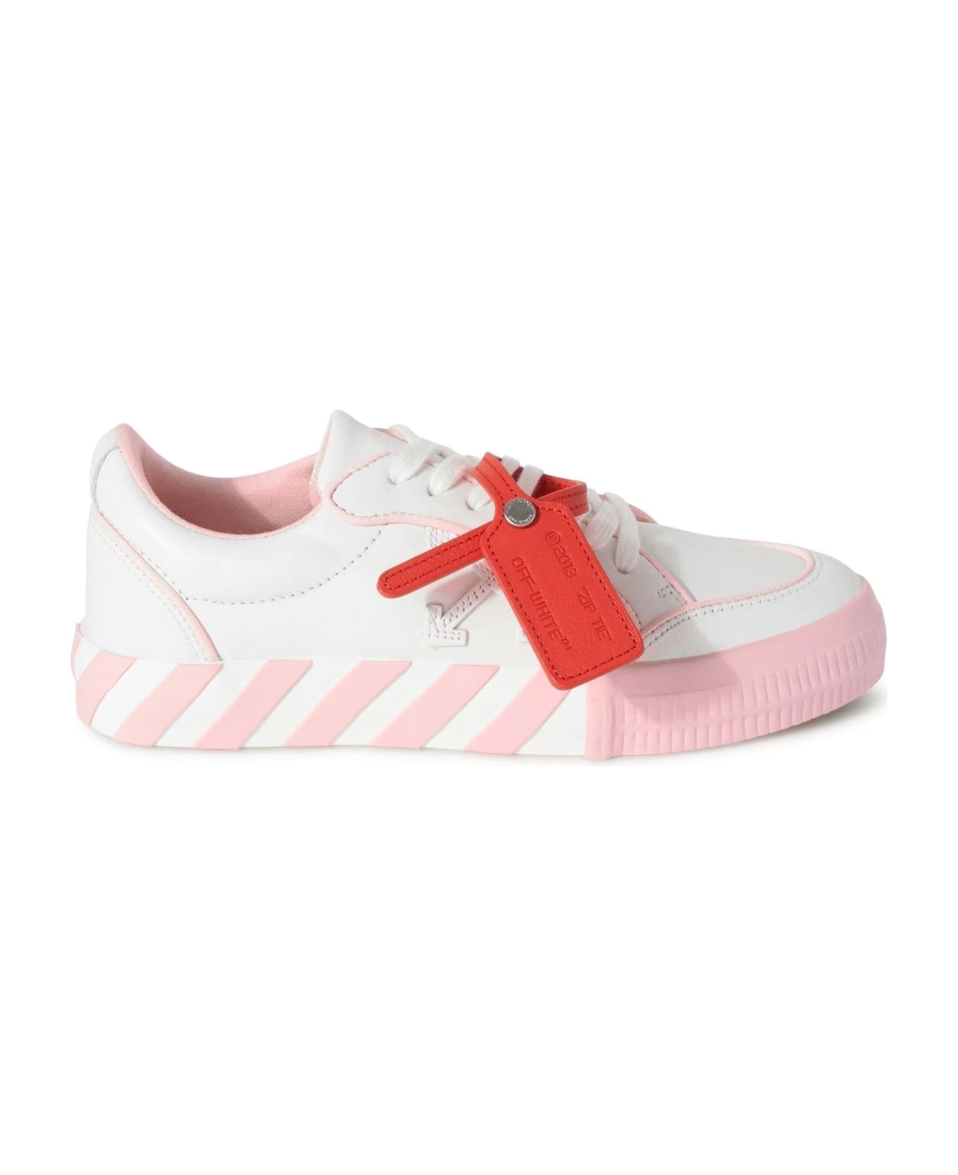 White Vulcanized Outlined sneakers, calf leather, contrasting trim, signature Arrows motif, round toe, front lace-up fastening, signature Zip Tie tag, flat rubber sole, signature Diag-stripe print