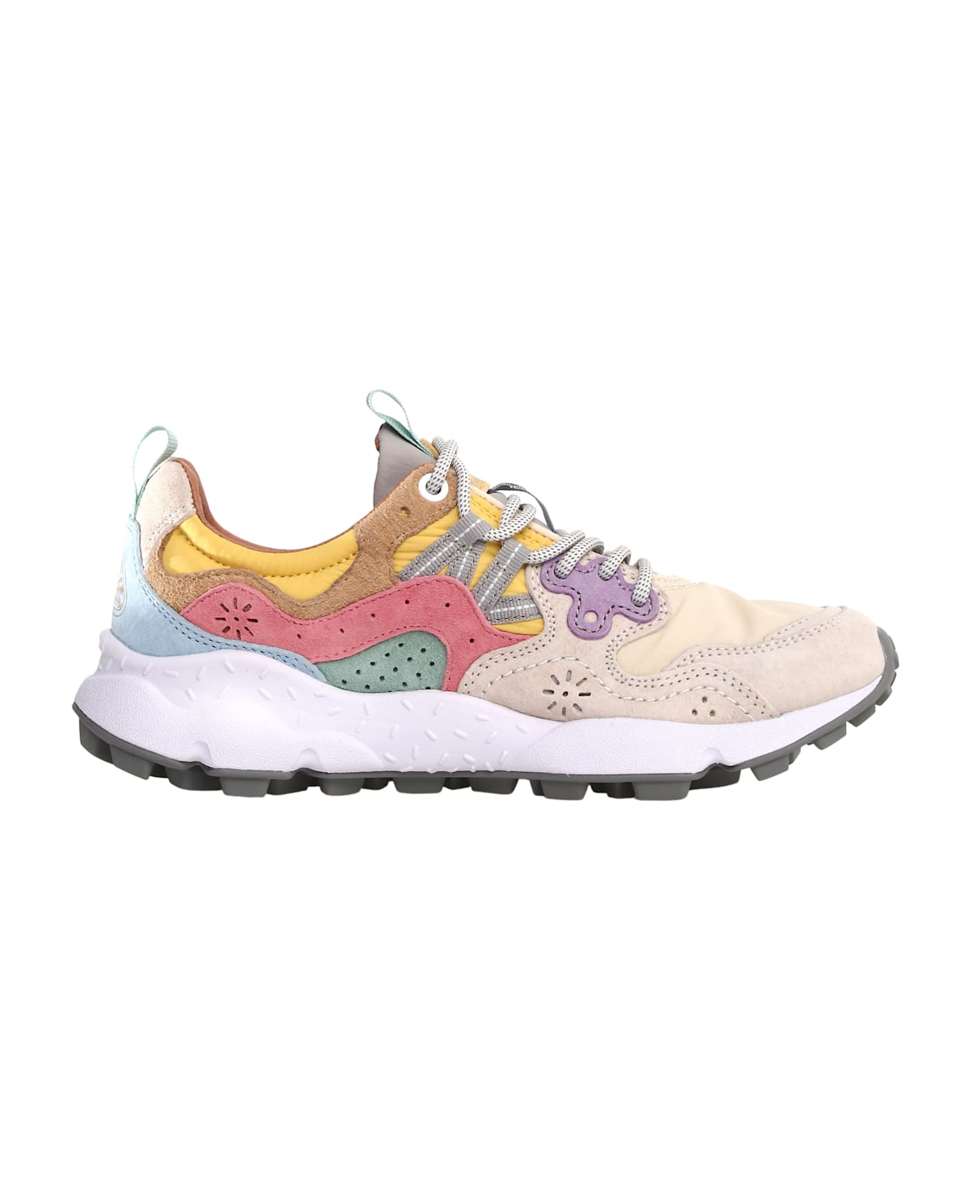 "Flower Mountain sneakers made of technical fabric with multicolored suede inserts. Reinforced eyelets and trekking laces. Anti-bacterial natural cork insole, ultra-light rubber sole with a serrated tread. "
