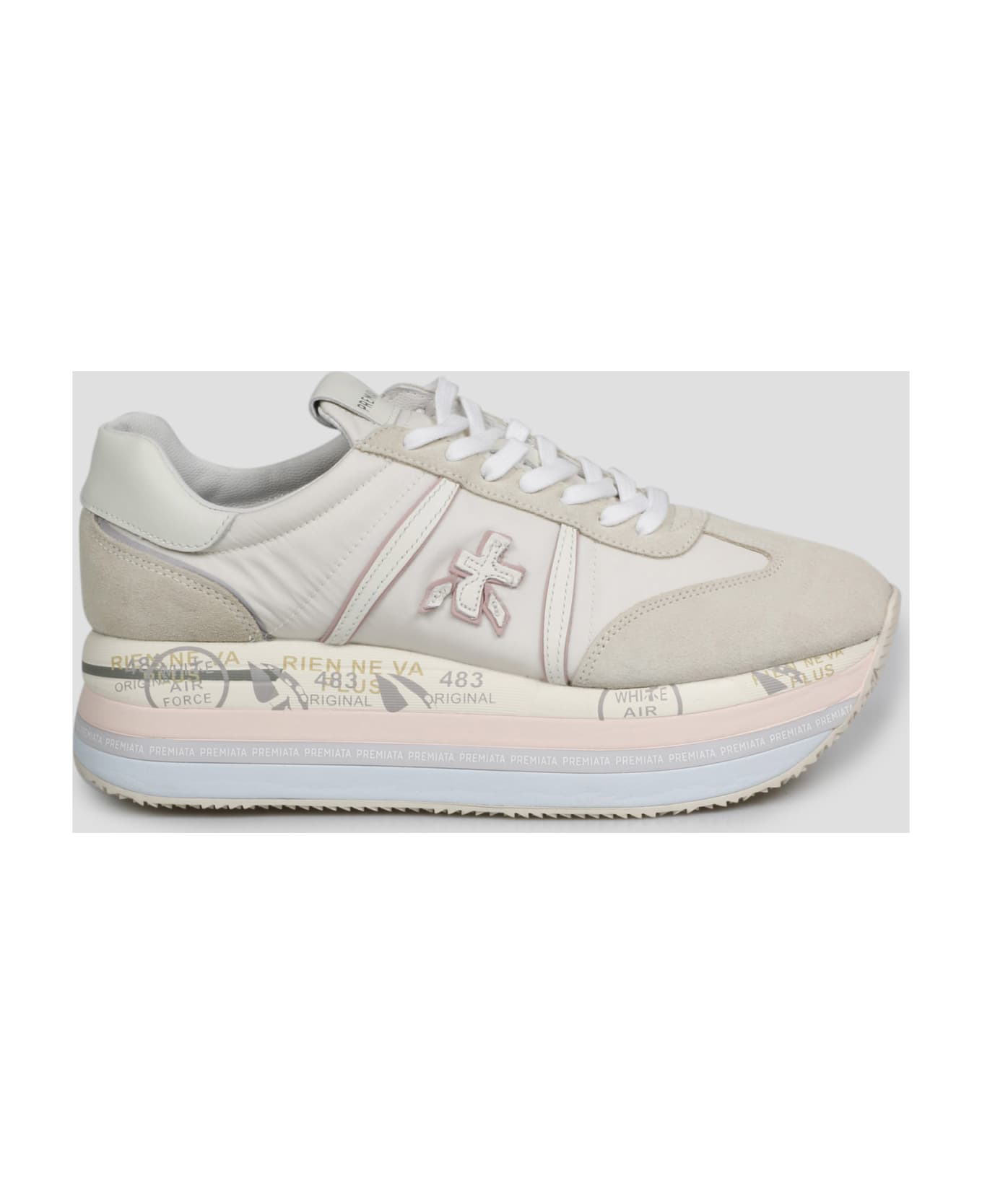 Beth sneakers by Premiata in nylon and suede. - SS23 - Tone-on-tone suede inserts - Leather logo on the sides - Pink details - Platform sole in printed rubber and colored striped pattern (5. 5cm) - Made in Vietnam - 55% Polyamide, 45% Calfleather