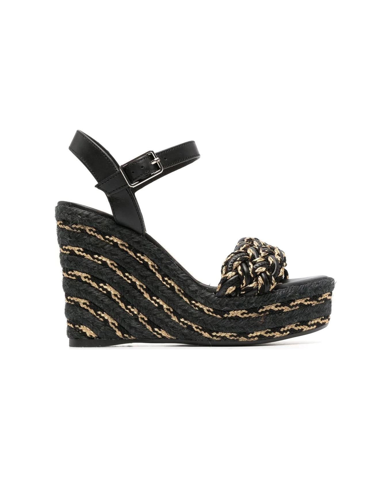 Black and gold Joaquina wedge espadrille by Castaner made of a mix of materials with a woven design, an open round toe and a buckled ankle strap fastening. Total height: 11 cm. Fit: buy your usual size.