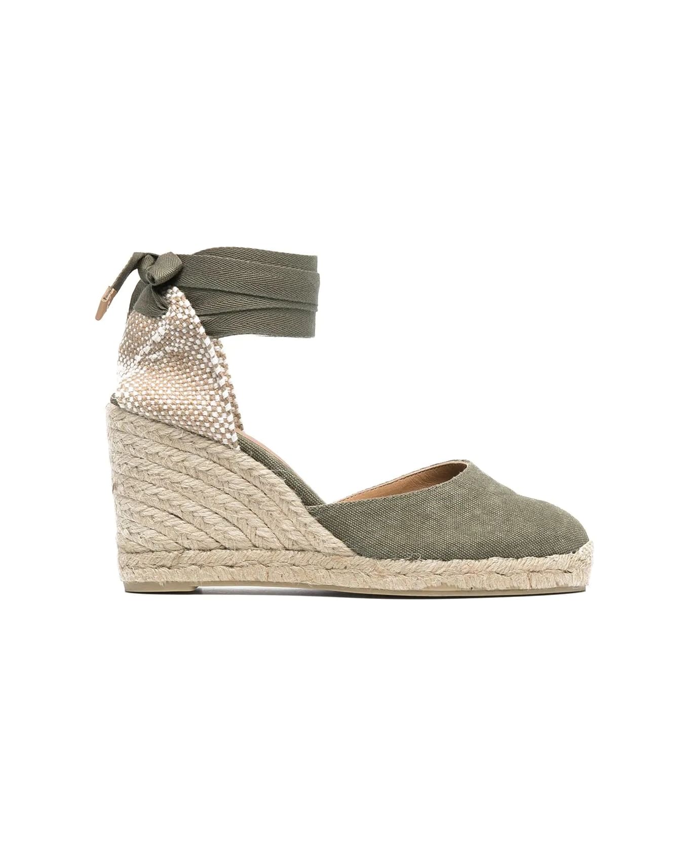 Carina model wedge espadrille by Castaner made of military green cotton canvas and characterized by round toe, leather insole, natural jute wedge with thin rubber sole and ankle closure with woven fabric strap on the heel. Total height: 9 cm: wedge height 8 cm and platform height 1 cm. Fit: buy your usual size.