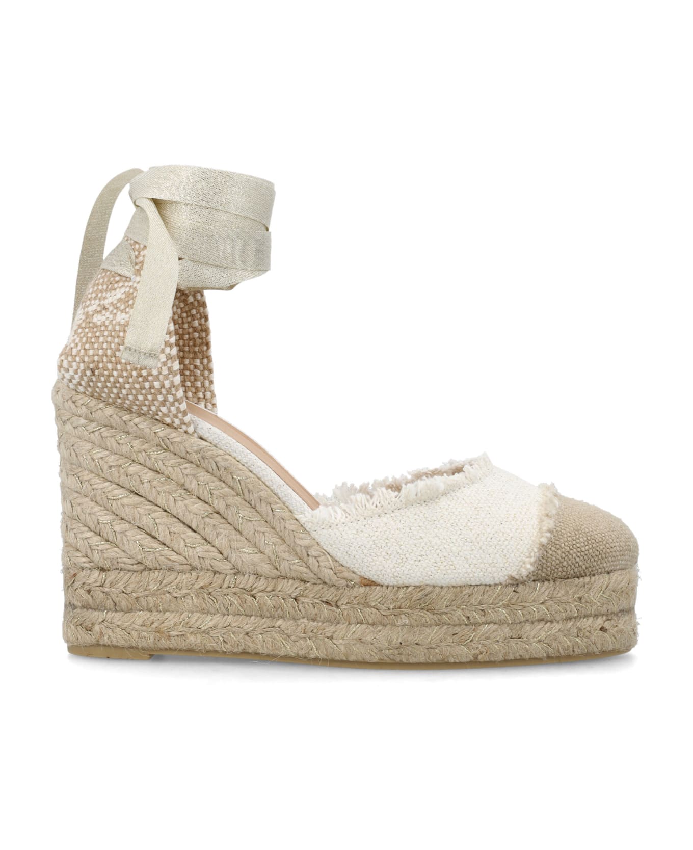 Linen Catalina 8 Espadrilles By Castañer. Featuring: Wedge Design Ankle Ties With Metallic Effect Round Toe Bicolor Linen Upper Frayed Trim Vulcanized Jute And Rubber Sole Heel: 8cm