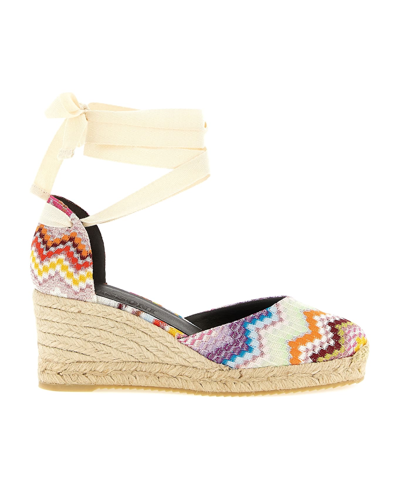 'Eva' zigzag raschel fabric espadrilles with lamé thread, leather lining, ankle ties, rope midsole, rubber sole.