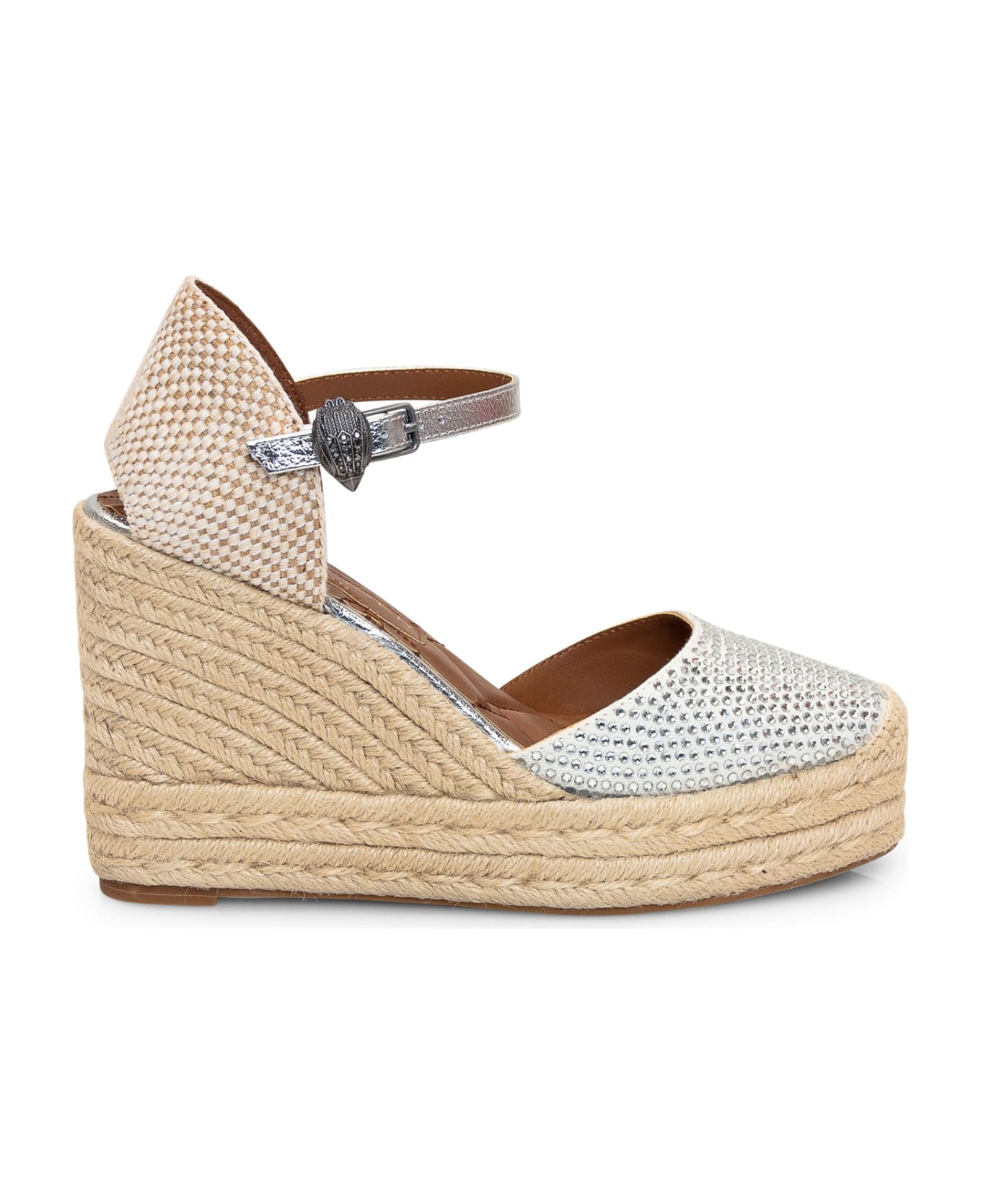 Wedge with closed toe. Ankle strap with eagle head. Rhinestone toe.