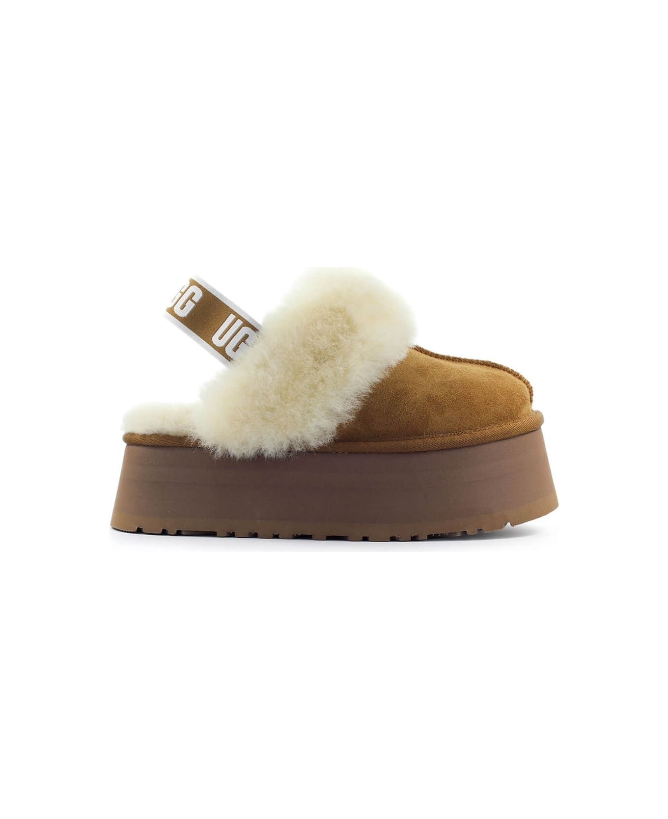 Ugg Funkette slipper made of suède in chestnut shades. Lined in warm sheepskin, it features a logoed rear elastic and a rubber platform sole. Height 5 cm.