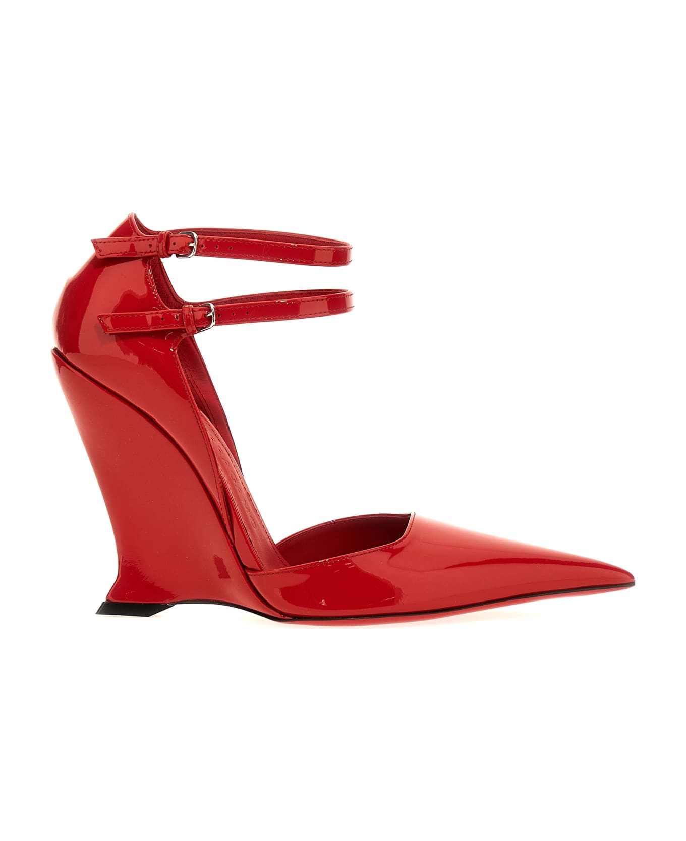 'Vidya' patent leather pumps with ankle straps, elongated toe and wedge shaped heel. Composition: 100% calfskin leather