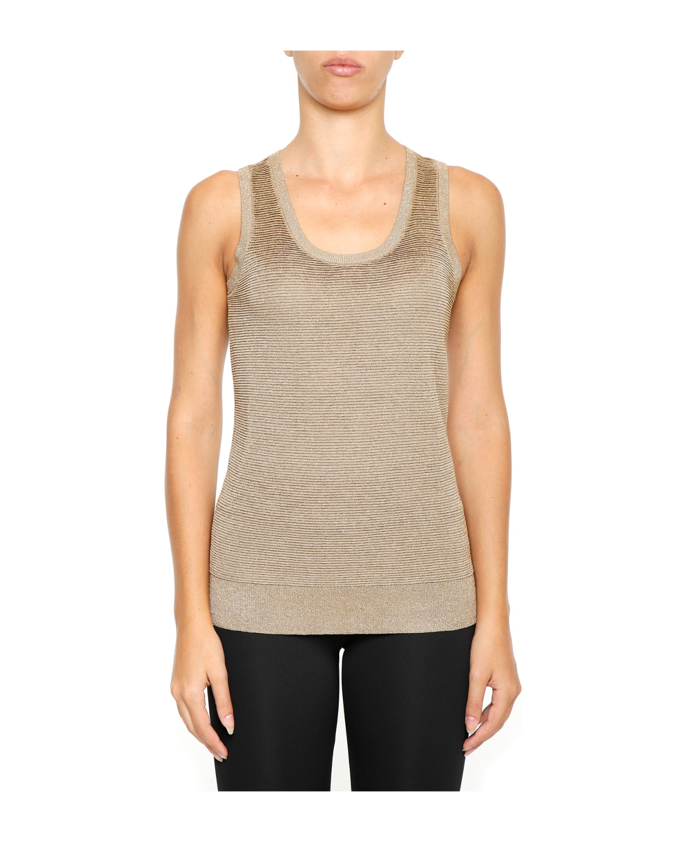 Michael Kors sleeveless stretch metallic top with ribbed hems. Metallic logo plate on the back. Model height is 177 cm and she is wearing a size S.